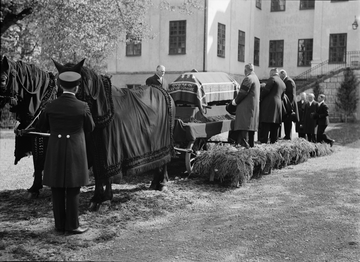 Kistan med stoftet efter friherre Fredrik von Essen placeras på vagnen för färd från Salsta slott till Lena kyrka