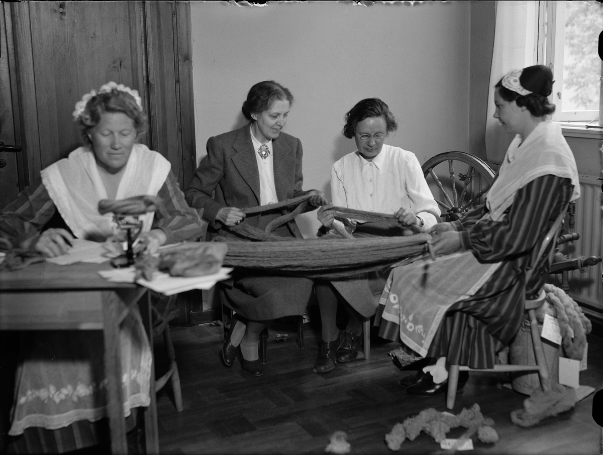 "I mitten prisbedömarna, fröknarna Ester Carlsson och Laijla Wallin", till vänster hemkonsulenten Rut Ingeborg Högstedt, som förde protokollet vid Jordbrukare-Ungdomens Förbunds distriktstävling i spånad i Hemslöjdens affär, Fyristorg 8