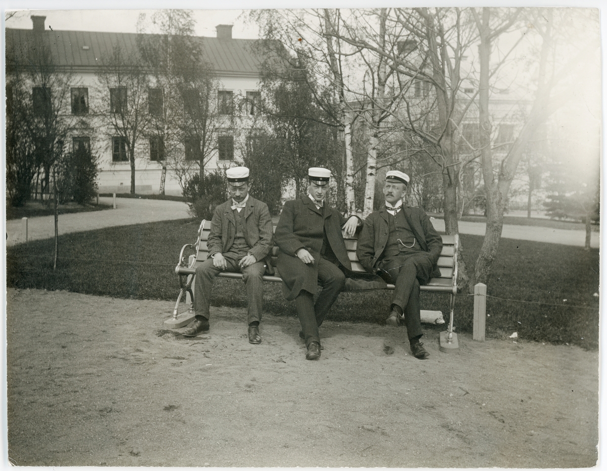Tre män iklädda kostym och studentmössor sittande på bänk i Universitetsparken, Uppsala omkring 1900