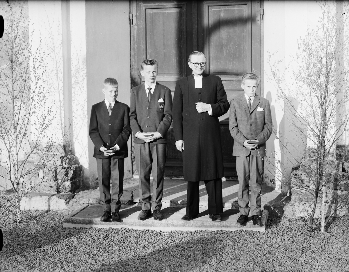 Kyrkoherde Emil Umareus med konfirmander, Hökhuvuds kyrka, Uppland