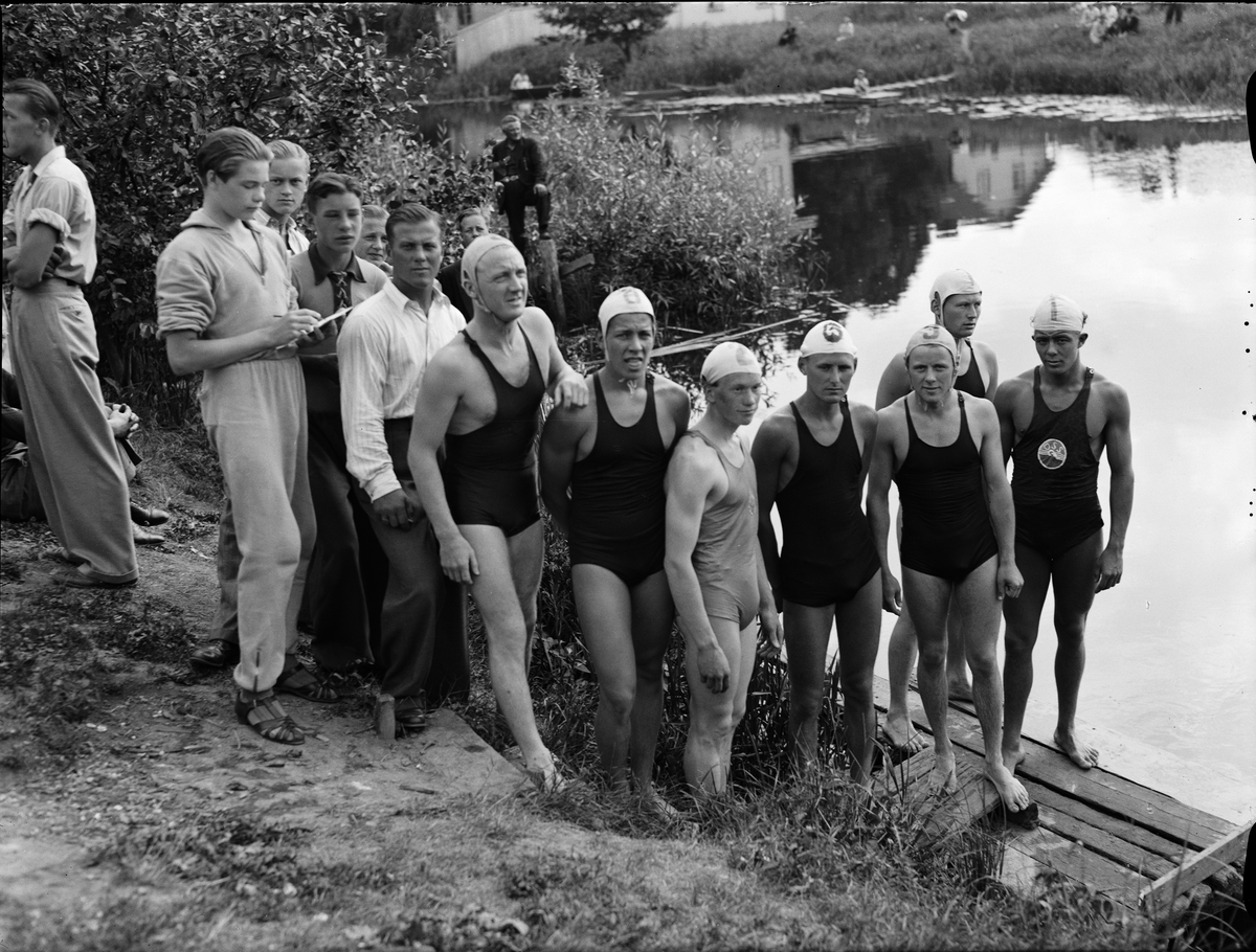 Deltagare i Strömsimningens fjärde sträcka på Fyrisåns strand. Längst till höger Bertil Ohlsson från Örebro Simsällskap
