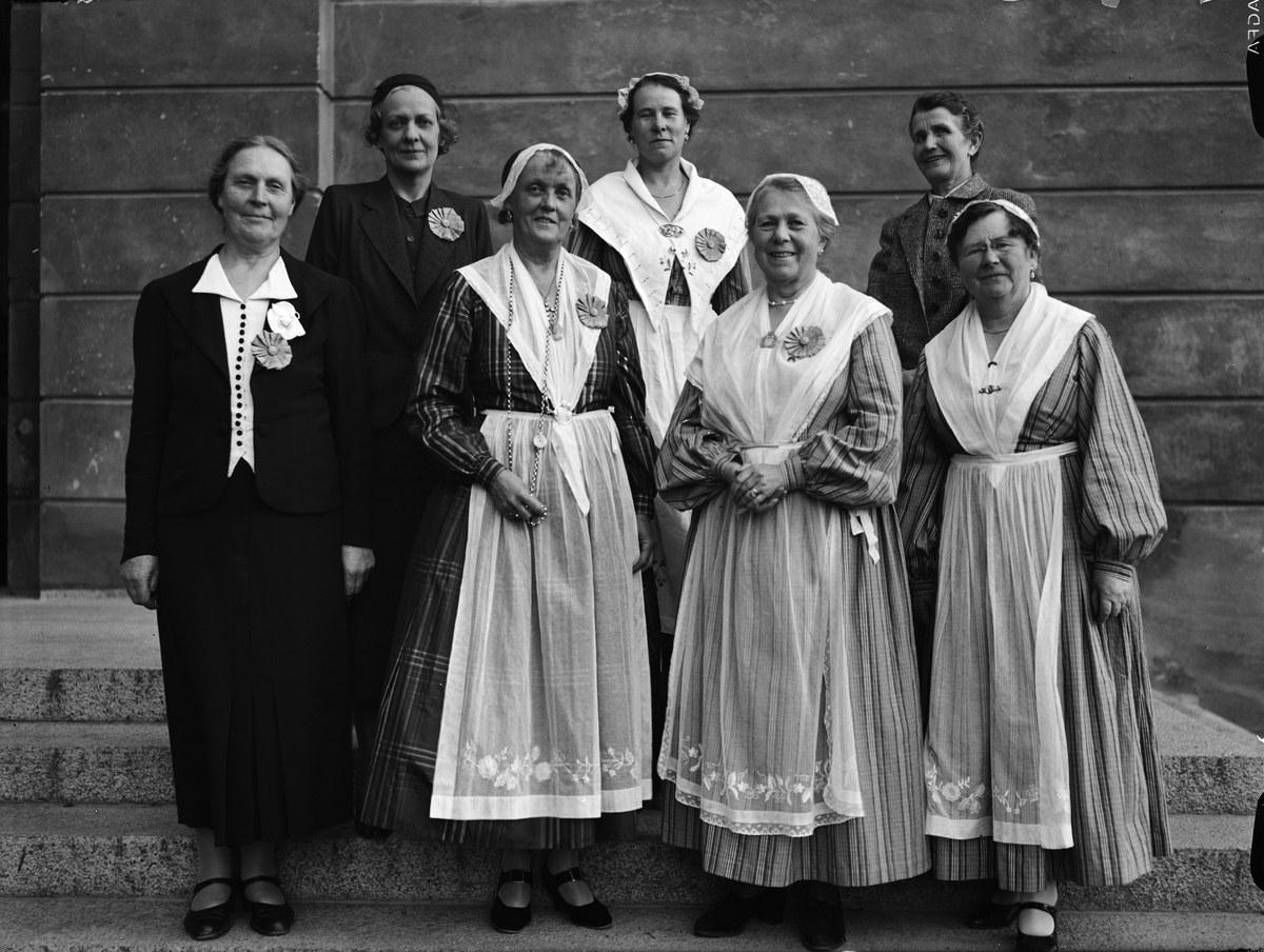 Vice ordförande Gertrud Wiklund, ordförande Fanny Nilsson och "grevinnan Lewenhaupt" samt kvinnor inom Uppsala läns husmodersförbund utanför Uppsala slott