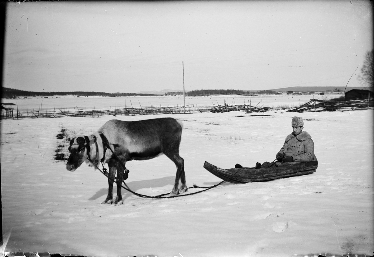 Man i uniform sitter i pulka dragen av en ren, Sverige