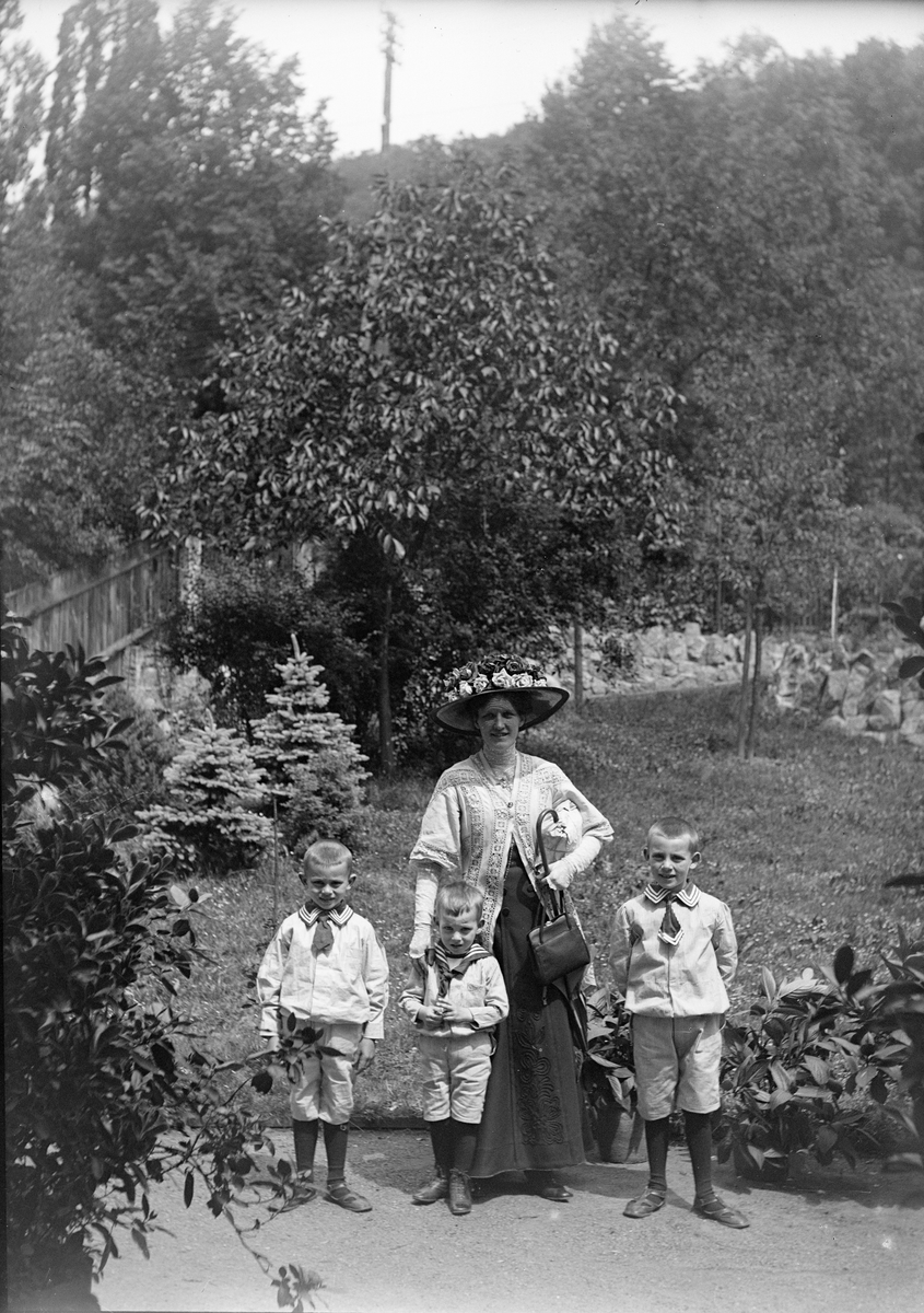Roland, Alf och Ingemar Liljefors står med okänd kvinna i parkmiljö, sannolikt Sverige