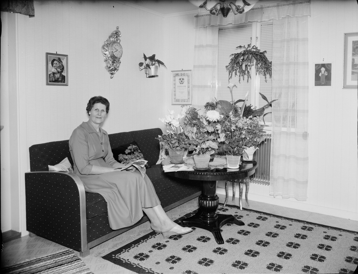 Kvinna i hemmiljö med blommor på ett bord, Östhammar, Uppland