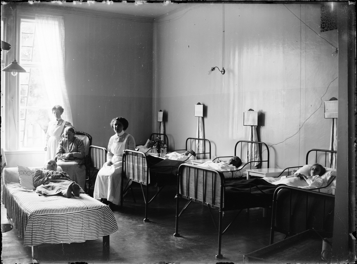 Titel: Sjuksal med patienter och sjukvårdspersonal, Östhammars lasarett.