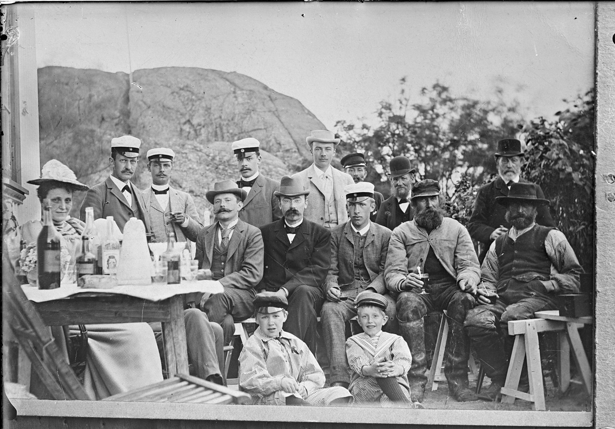 Reprofotografi - "grupp studenter och äldre lantbrukare i festligt lag i det fria", sannolikt Uppland