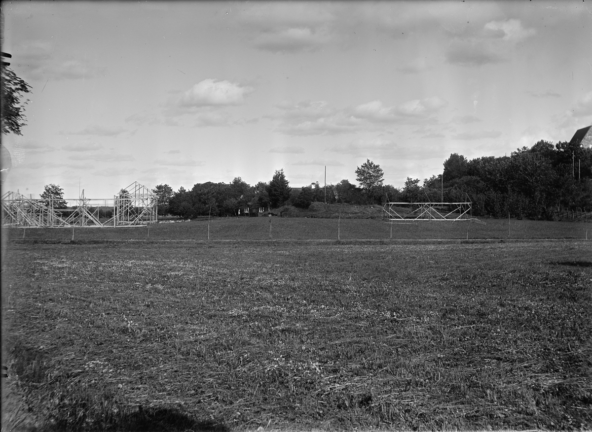 Titel: Modeller av friluftsmuseet Disagårdens byggnader utplacerade på plats i Gamla Uppsala år 1928