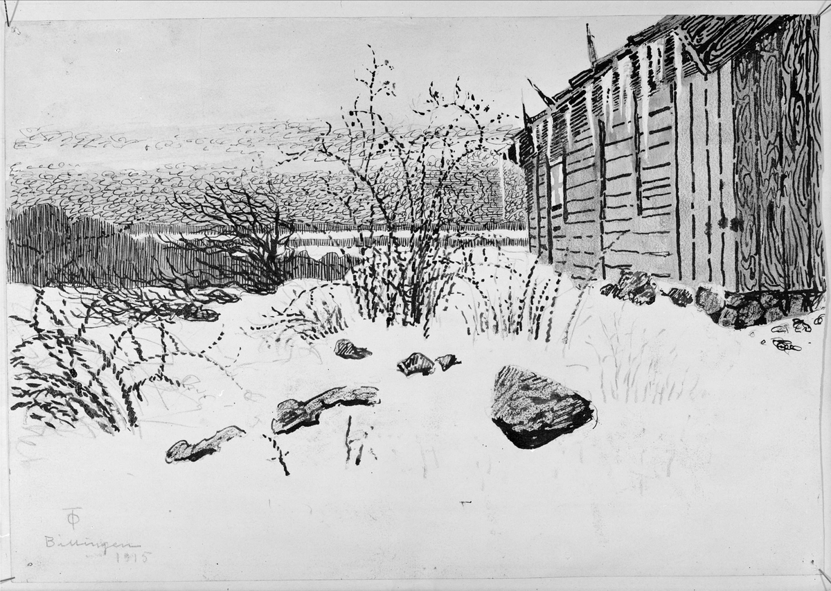 Konstverk - grafiskt blad med motiv från Billingen, signerat 1915 av konstnären Olof Thunman