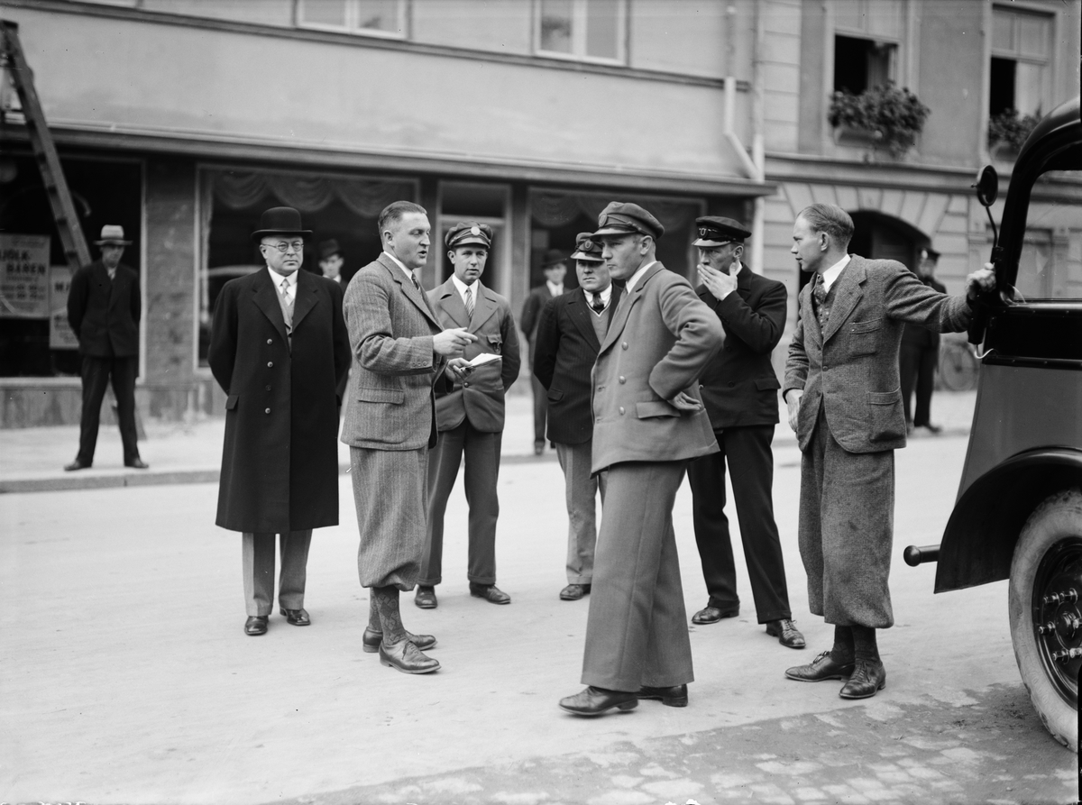 Samling på Fyristorg inför Upplands fornminnesförenings höstutflykt. I bakgrunden föreningens sekreterare bibliotekarie Oskar Lundberg