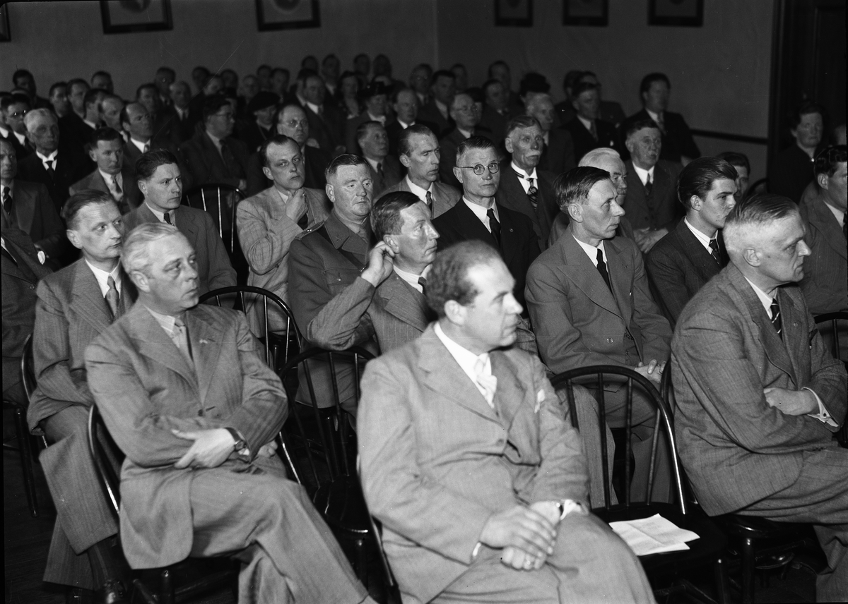 Åhörare på Upplands Köpmannaförbunds konferens i Uppsala Handelsförenings lokaler, Svartbäcksgatan 12. Till höger i främsta raden den nye ordföranden köpman Joel Åhlin