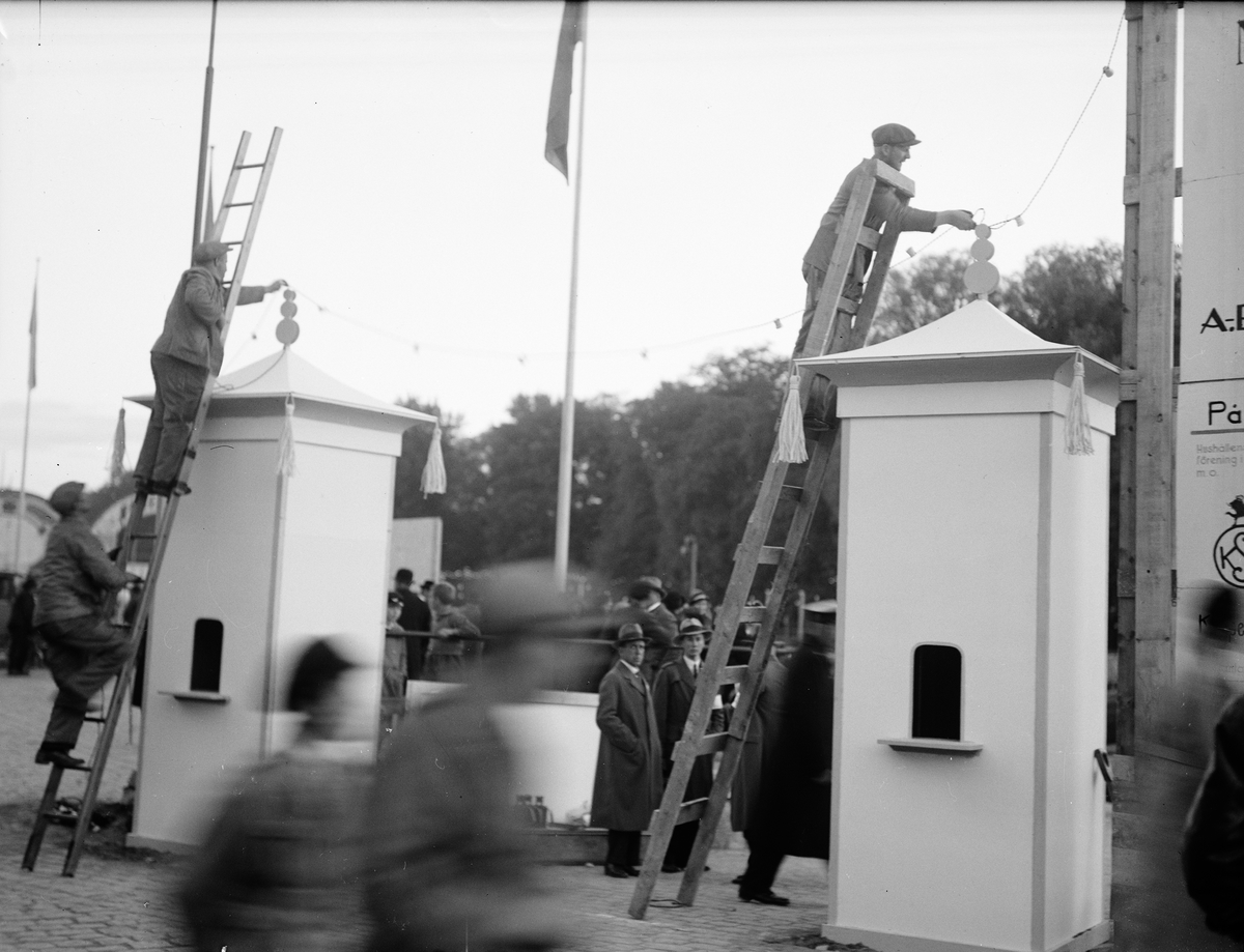 Byggnadsarbetare gör färdigt biljettkurerna till Barnens Dags nöjesfält på Hamnplan, Kungsängen