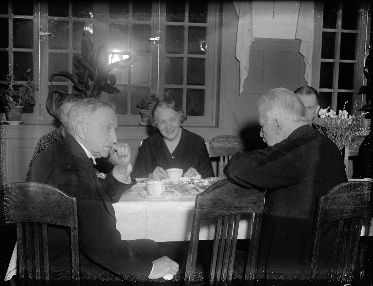 "Vacker femtioårsfest" - Uppsala arbetarinstitut firar 50-årsjubileum, professor Arvid Gustaf Högbom och professor Rutger Sernander vid kaffebordet, KFUM-borgen, Uppsala 1933