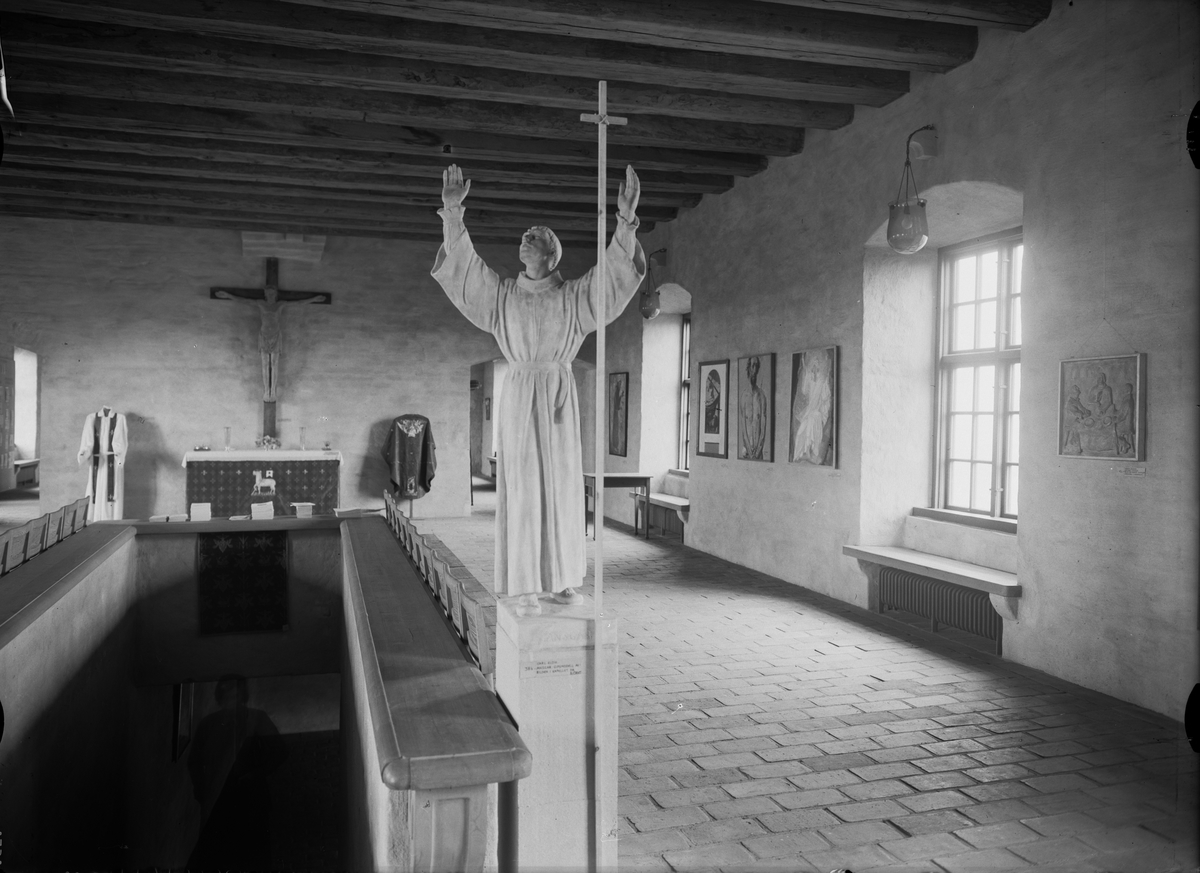 "Carl Eldhs gipsmodell av Ansgarsbilden i kapellet på Björkö och mot bakre väggen en altaranordning med ett av konstnären Alfred Backlund utfört krucifix" på utställningen 'Nutida kyrkovård och kyrkokonst' i Rikssalens övre galleri, Uppsala slott