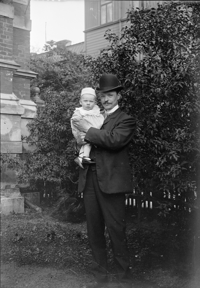 Ung man med litet barn, sannolikt en av sönerna till Ruben och Christiane Liljefors, i famnen ute på gård i stadsmiljö, sannolikt i Sverige
