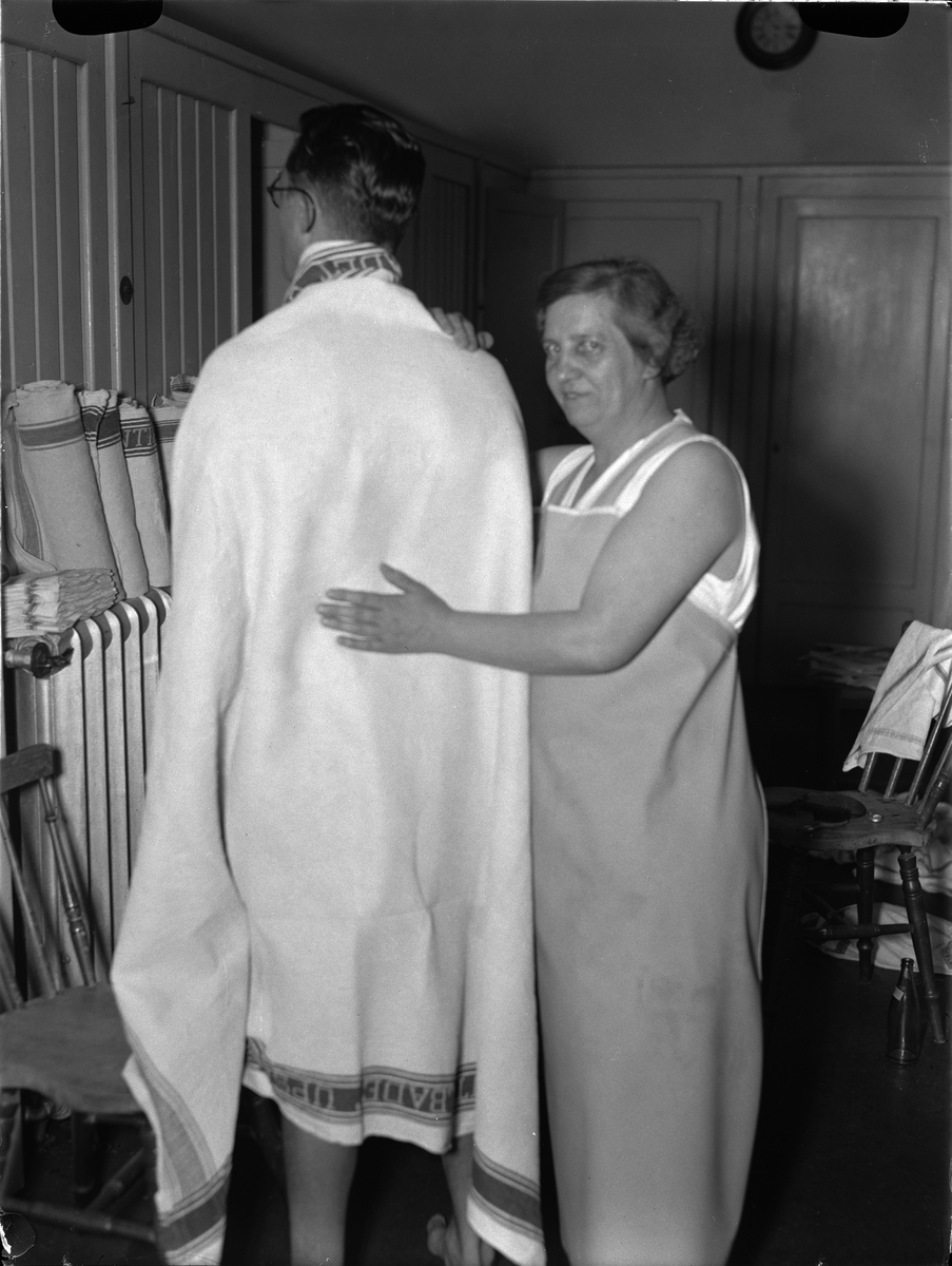 Trotjänarinnan Maja Berggren med kund i förstaklassbastun, Centralbadet vid Gamla torget