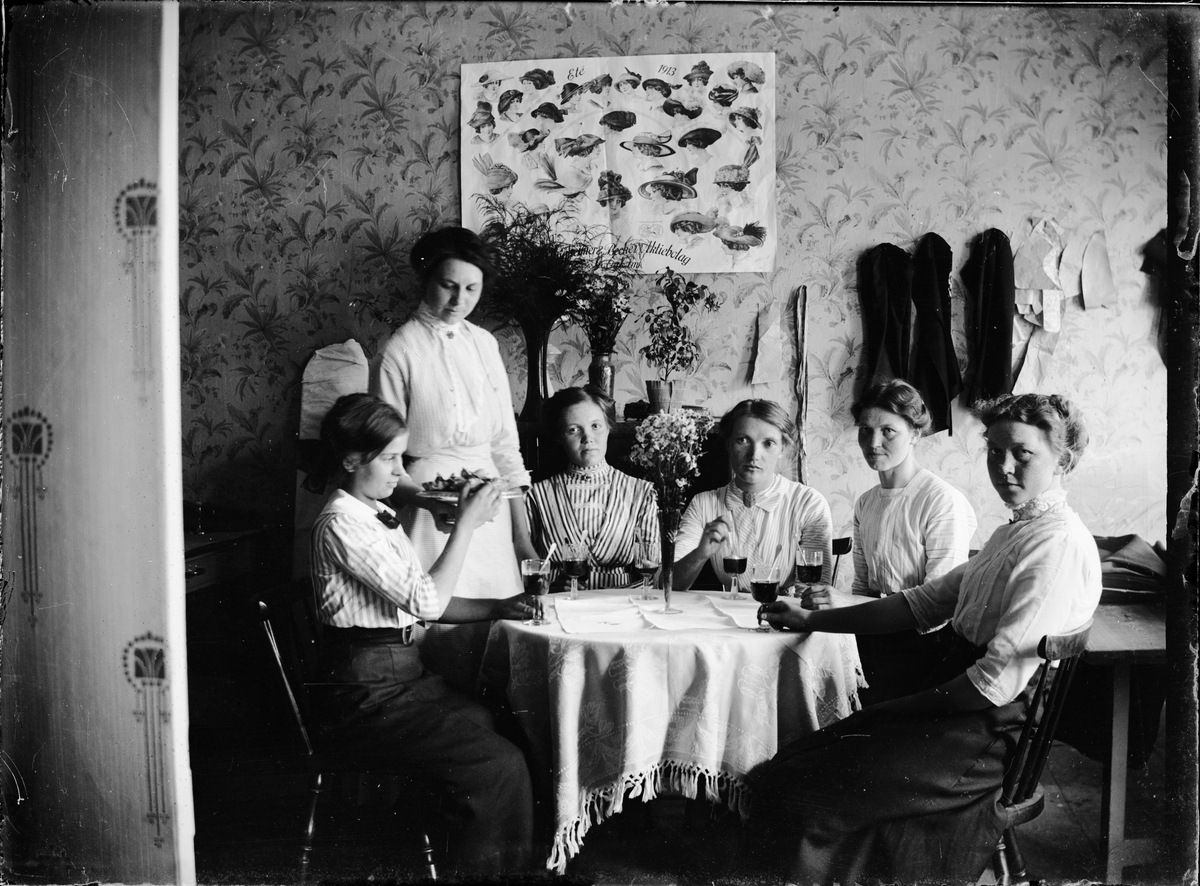 Kvinnor vid ett bord med varsitt glas i en syateljé, Östhammar, Uppland