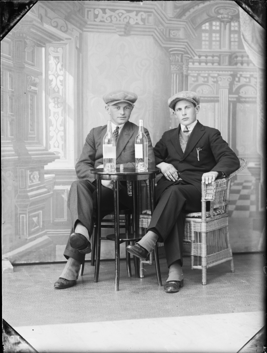 Två unga män sitter vid ett bord med flaskor på, Östhammar, Uppland 1929