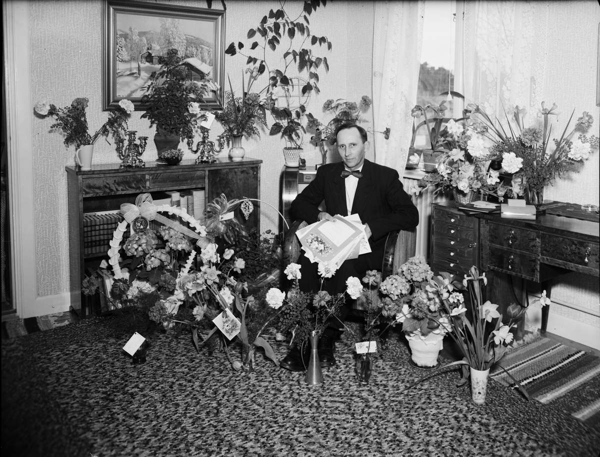 Ruben Jansson omgiven av blommor i hemmet, Östhammar, Uppland
