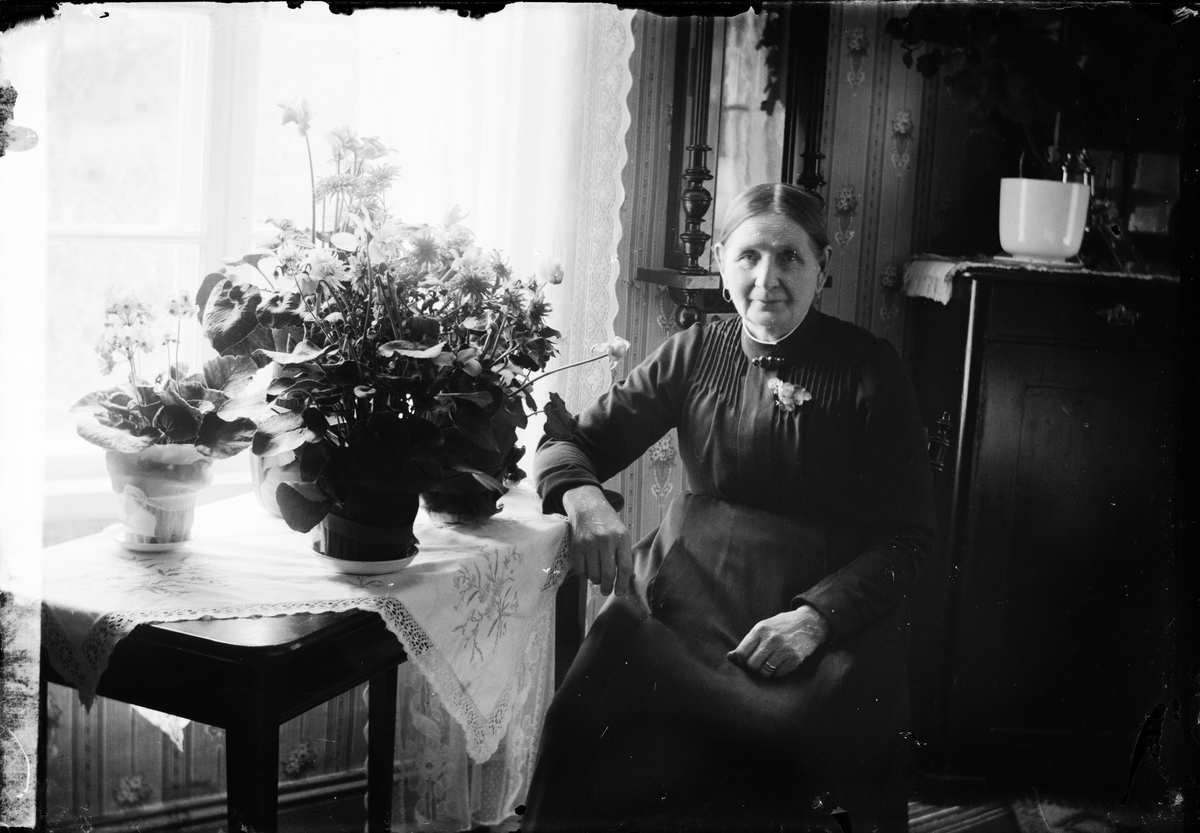 Kvinna sittande vid bord med krukväxter, Östhammar, Uppland