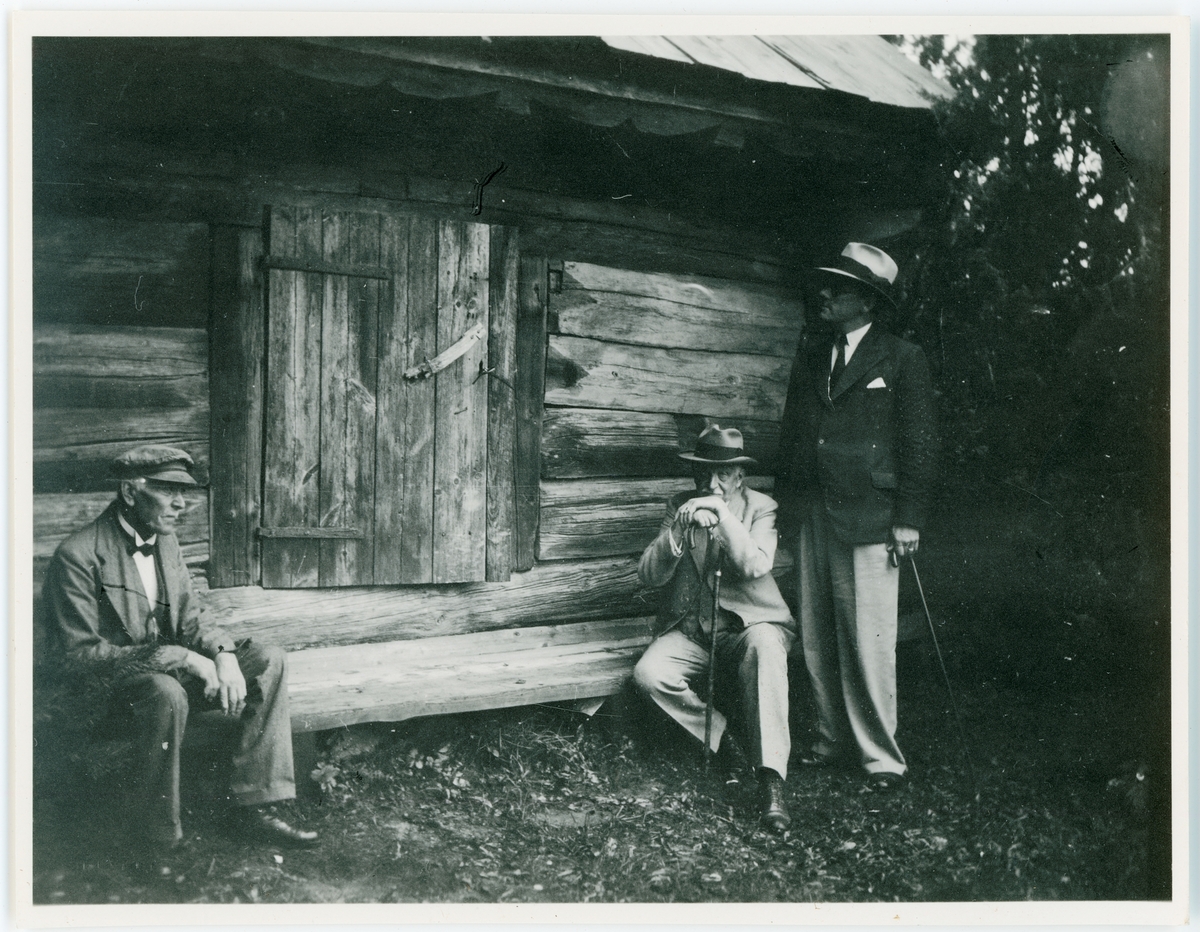 Tre män vid en timmerbyggnad, Söderby-Karl, Uppland
