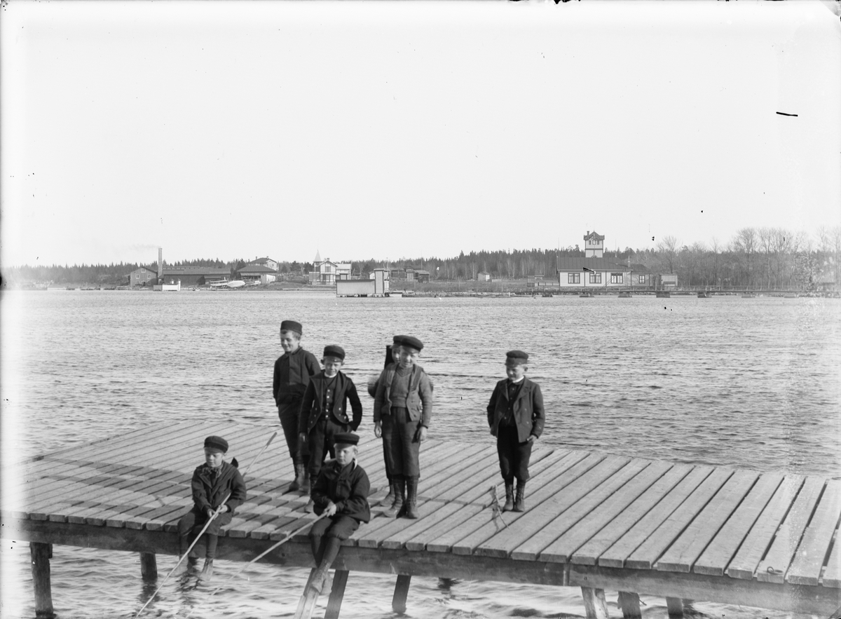 Mete vid "Näckenbryggan", Längs ut till vänster med metspö Ivar Nordström, Östhammar, Uppland 1905