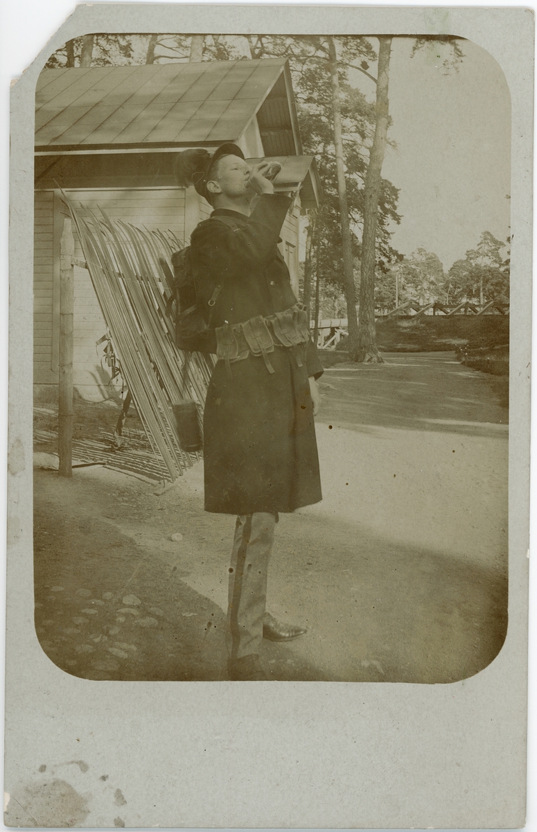 Brevkort - militär dricker ur en fältflaska, Kalvhagen, Polacksbacken, Uppsala