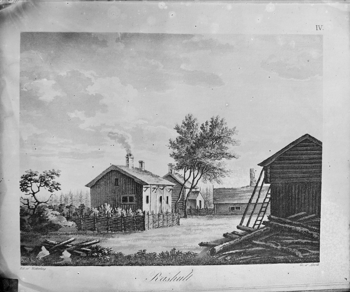 Reproduktion - gravyr av Akrell efter teckning av Wetterberg. Carl von Linnés födelseplats Råshult, Stenbrohults socken, Småland