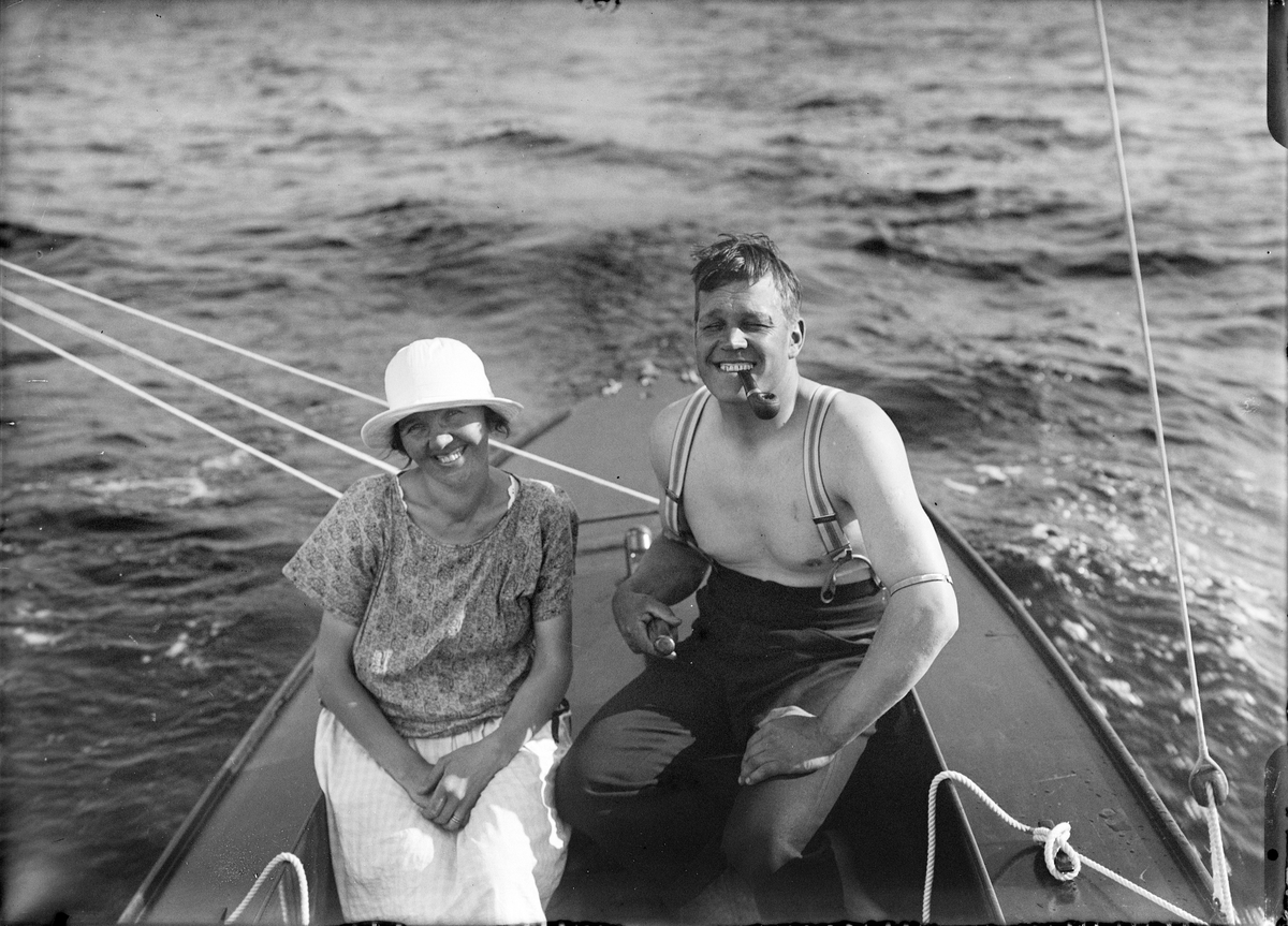 Kvinna och man i segelbåt, sannolikt på Ekoln, Uppland