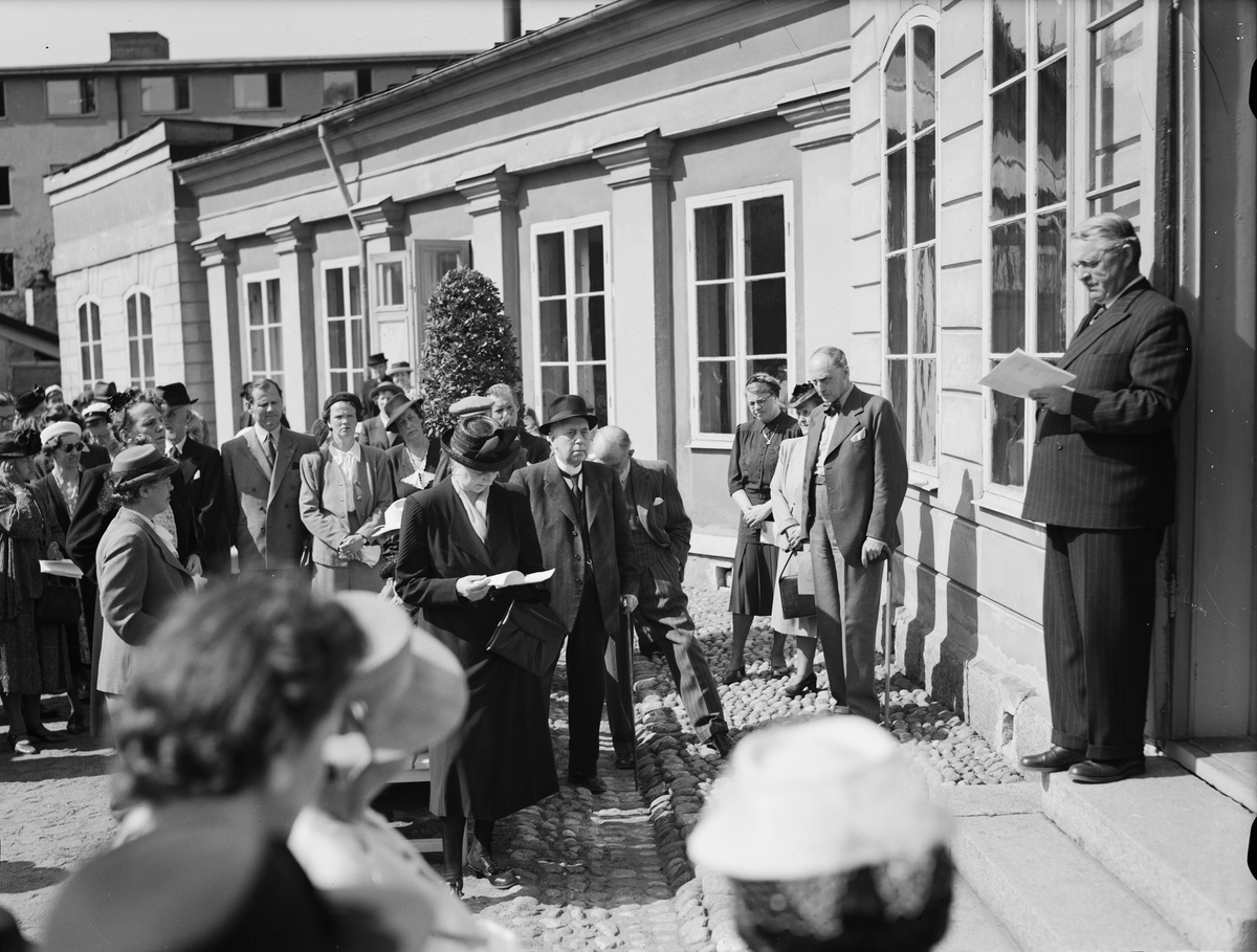 Landshövding Hilding Kjellman inviger Upplands Konstförenings skulpturutställning i Linnéträdgården, Uppsala 1947