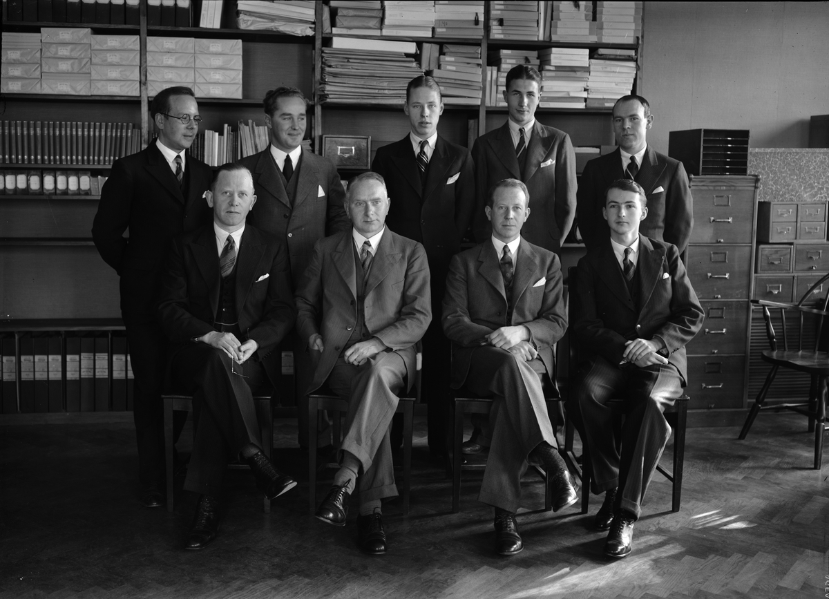 Grupporträtt - personal hos hundrarårsjubilerande AB Lundequistska Bokhandeln, Drottninggatan - Östra Ågatan