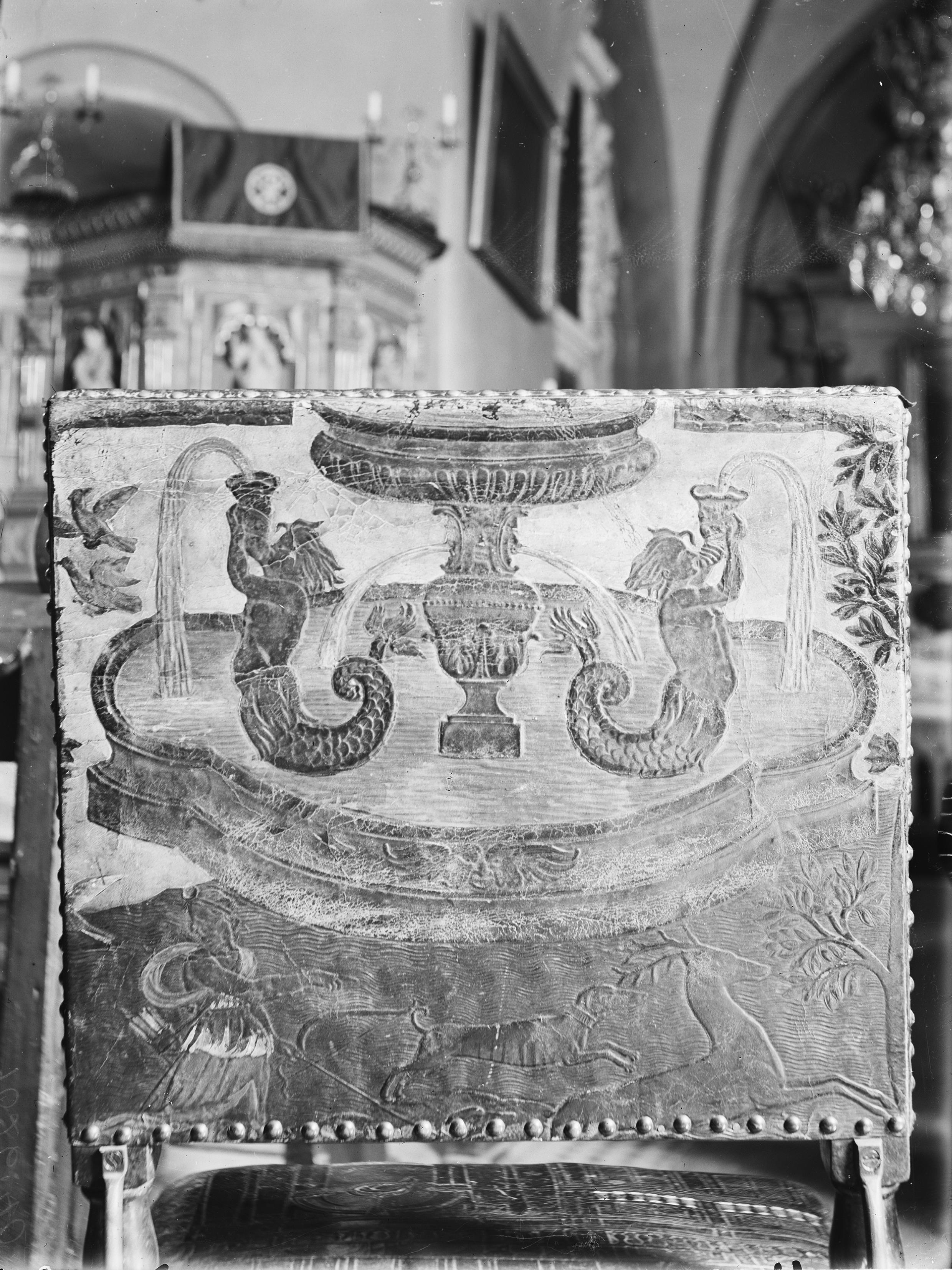 Stol, italiensk valnöt och gyllenläder, 1600-talet. Ryggstödet, baksidan.