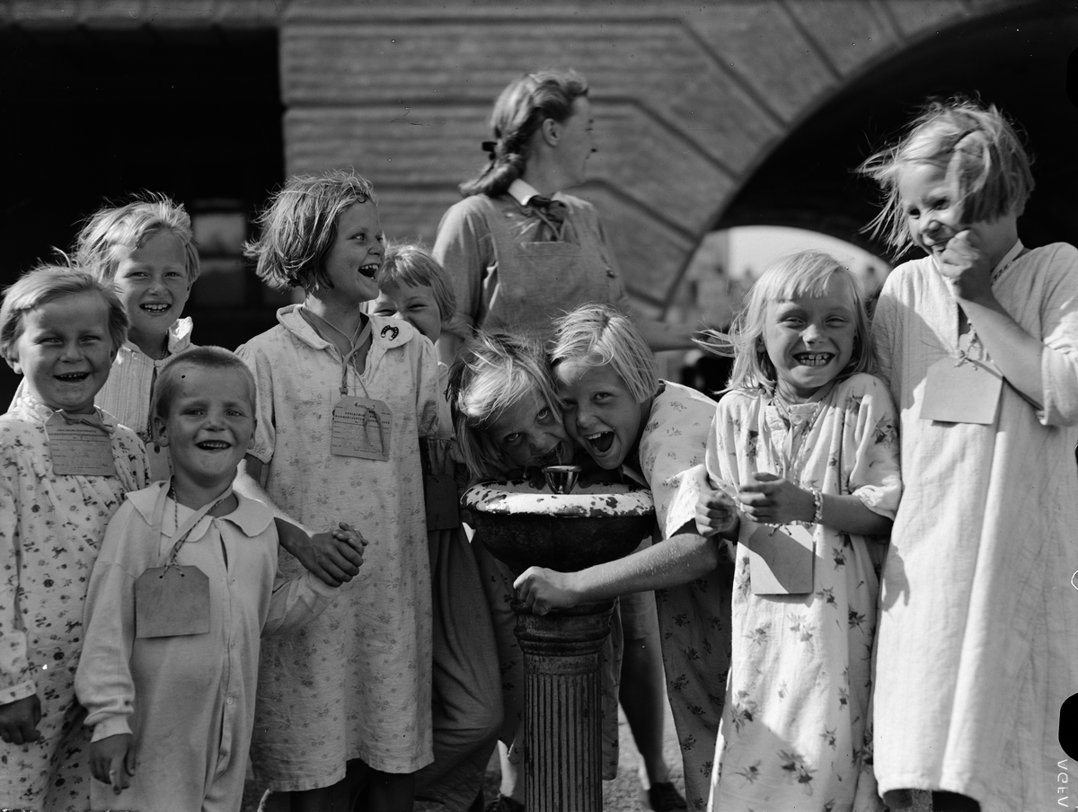 Karelska flyktingbarn utanför flyktingförläggningen i Vaksalaskolan