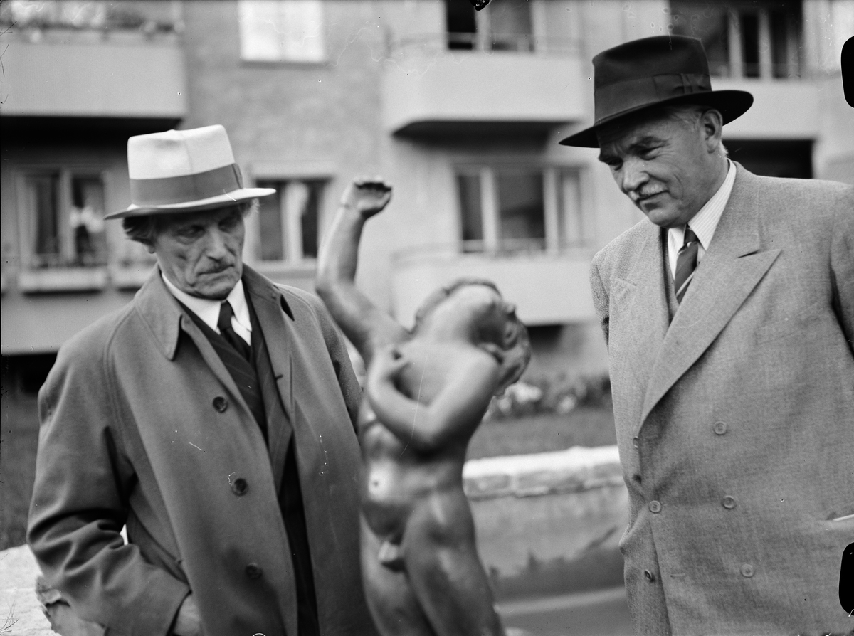 Skulptören Carl Eldh och byggmästaren Anders Diös framför Carl Eldhs skulptur Näcken i kvarteret Fågelsången