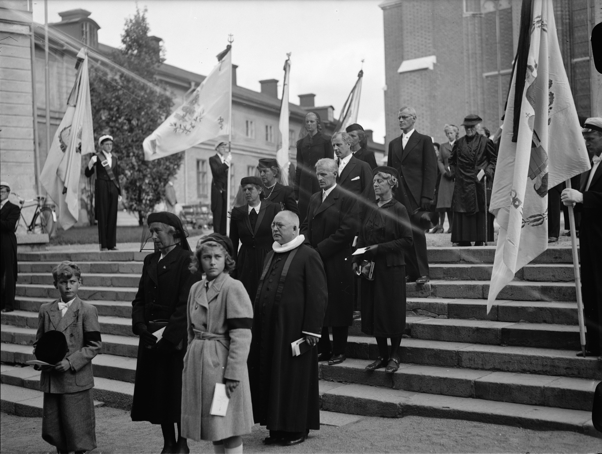 De närmast sörjande utanför Uppsala domkyrka vid jordfästningen av professor Fredrik Paasche