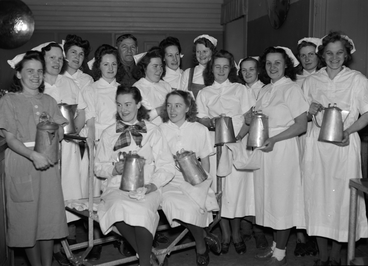 Personalen i matsalen vid återinvigningen av Upplands Regementes bibliotek och mässar för manskap och befäl under utbildning