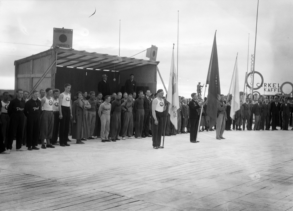 "Idrottsmännen åhöra borgmästare Kants invigningstal" vid invigningen av Uppsalas första idrottsmässa, festplatsen i Svartbäcken