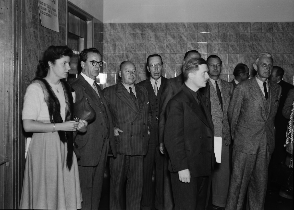 "Köpenhamnska kommunalmän bese Upsalas badanläggningar", Centralbadet, Uppsala 1945