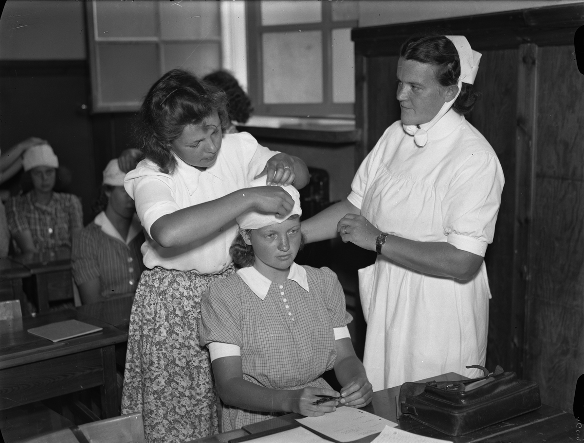 Gymnasieelever vid Högre Allmänna Läroverket, nuvarande Katedralskolan, lär sig att lägga bandage