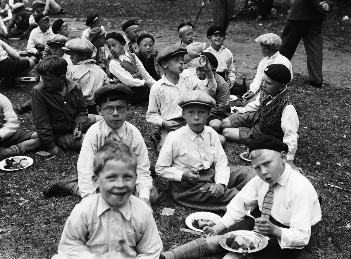 Pojkar äter mat på SMK Uppsalas utflykt för Uppsalabarn, sannolikt Länna i Almunge socken