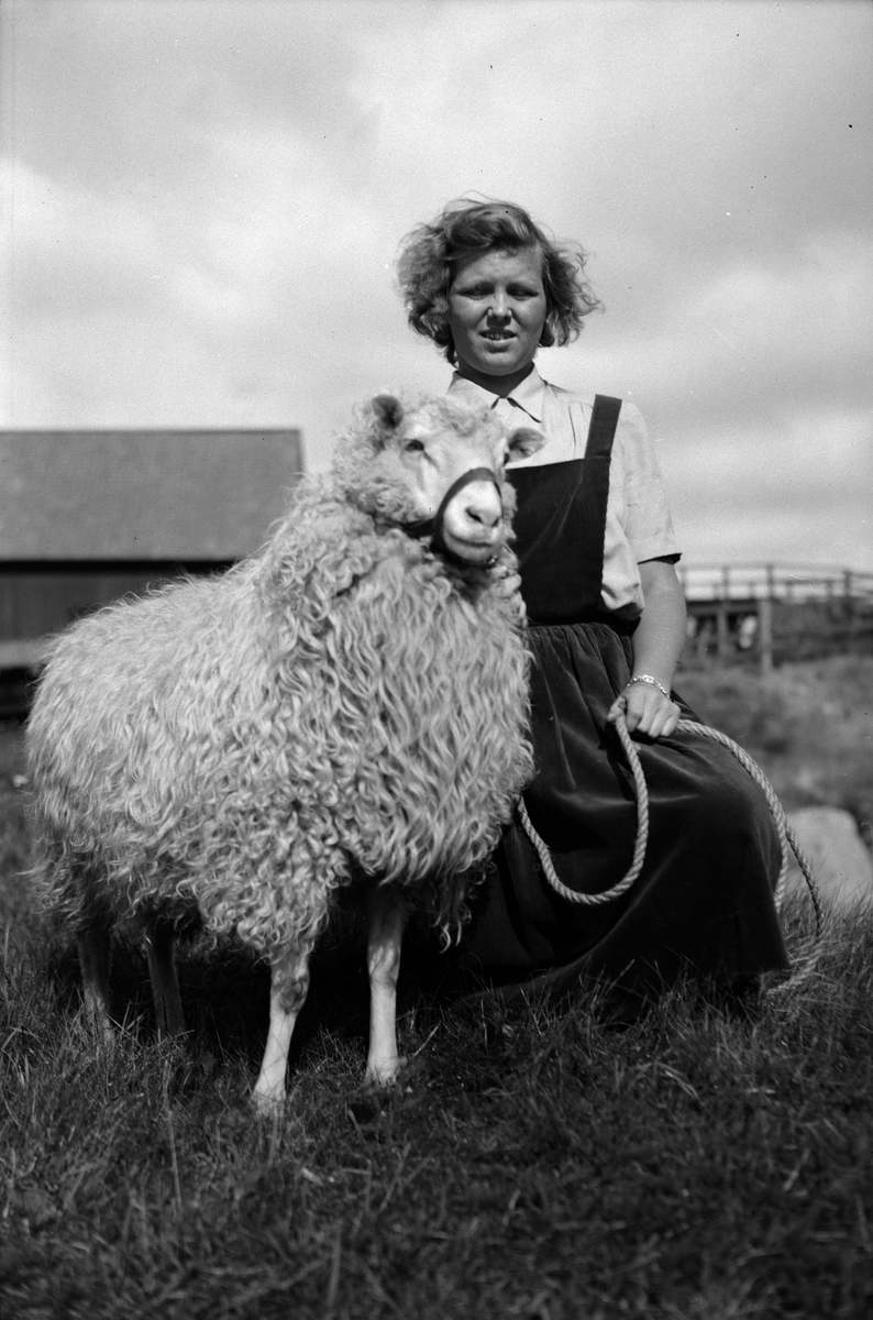 Svenska fåravelsföreningens 114:de baggauktion vid Ultuna - fåravelsföreningens assistent Carin Lindblad med Korsnäs Klöver Ess, Uppsala 1945