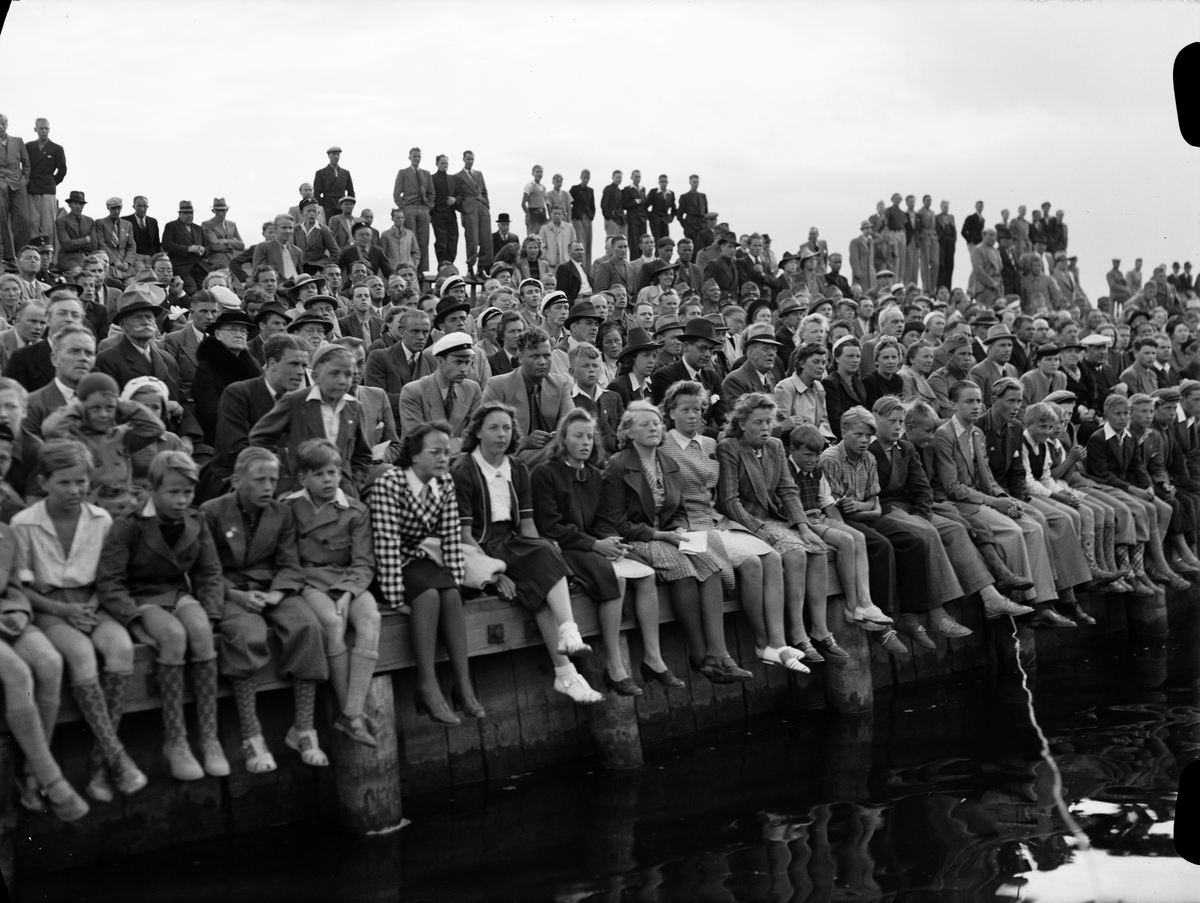 Åskådare vid Fyrisåns strand under simtävlingen i Fyrisbadet