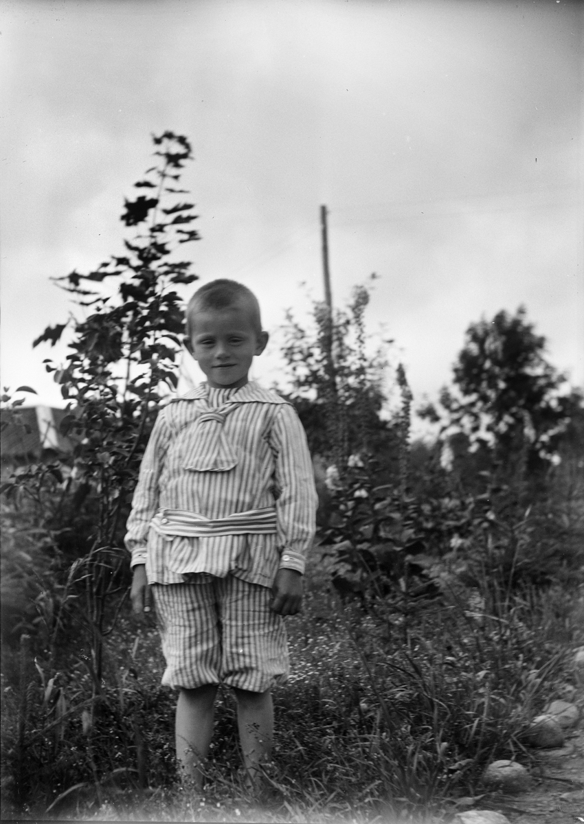 Sannolikt Alf Liljefors, son till Christiane och Ruben Liljefors, står ute i trädgård, sannolikt i Sverige