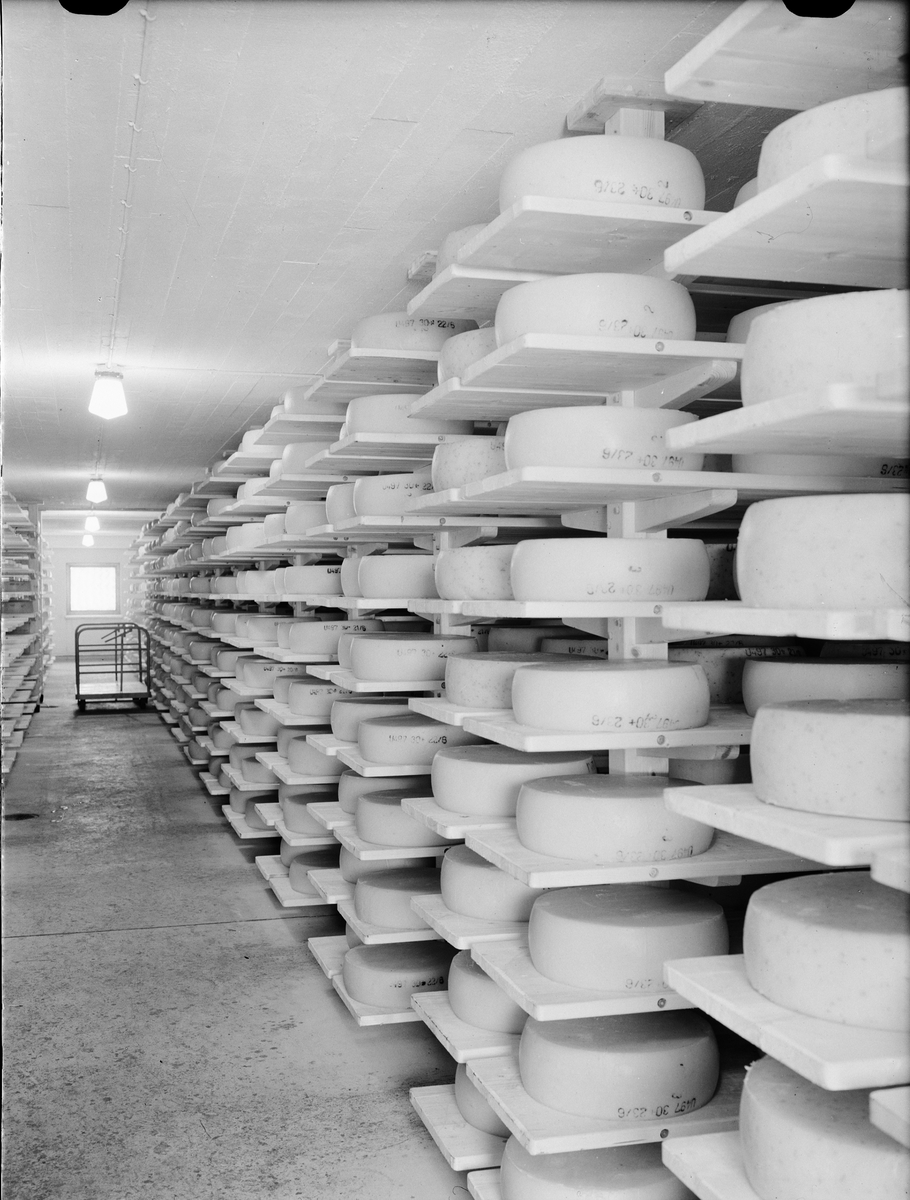 Lagring av ost på Mjölkcentralen, kvarteret Tor, S:t Persgatan, Uppsala i juli 1946
