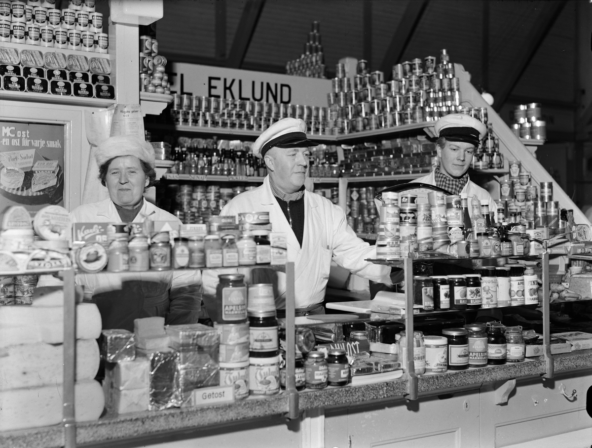 Köpman Axel Eklund med anställda i Eklunds Ostaffär i den 40-årsjubilerande Saluhallen