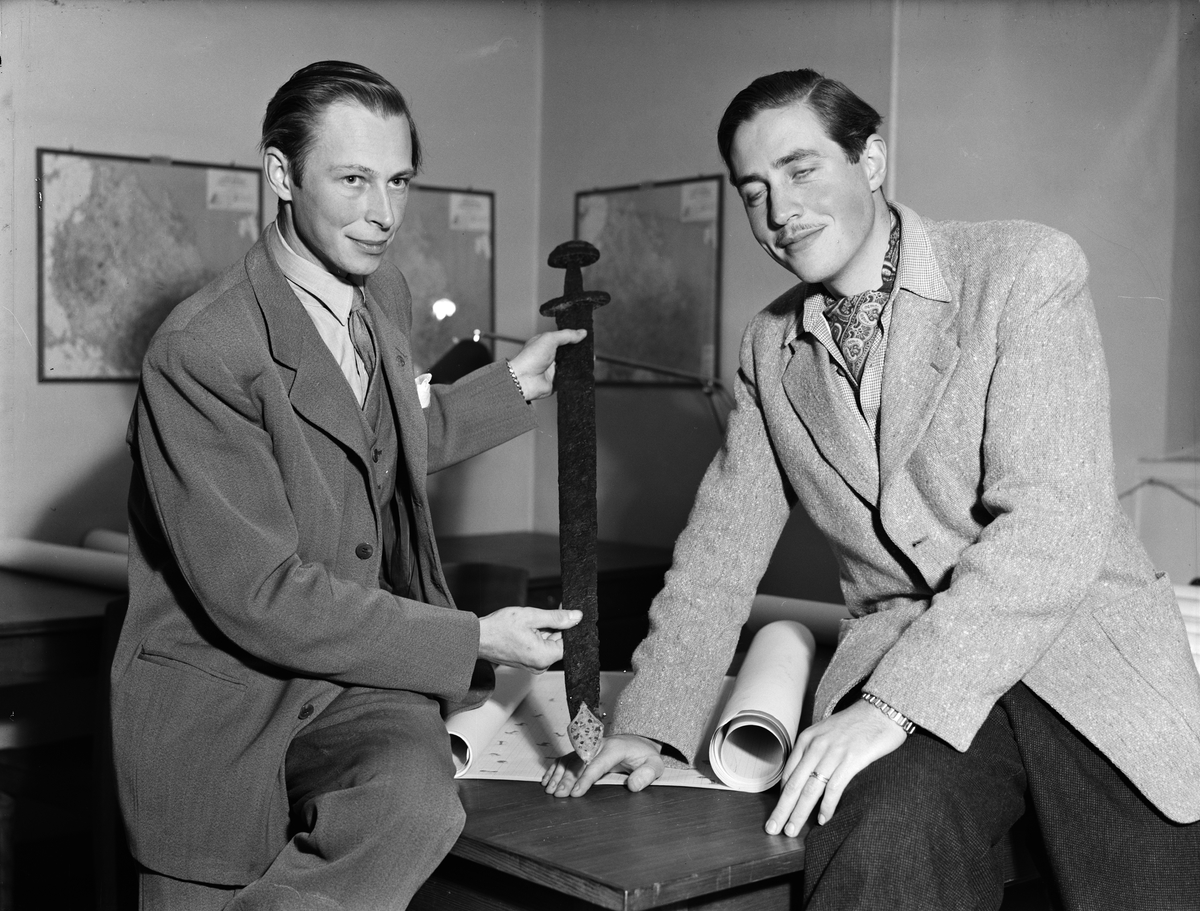 "Båtgravar i Valsgärde berättar om storbondesläkt i Fullerö" - Bengt Schönbäck och Björn Allard med ett meterlångt svärd, Museet för nordiska fornsaker, Uppsala 1948
