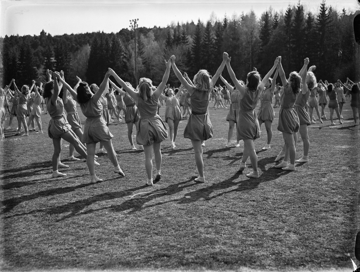 "Den kvinnliga masstruppens uppvisning präglades av precision och grace" vid Upplands Gymnastikförbunds 25-årsjubileum på Studenternas Idrottsplats