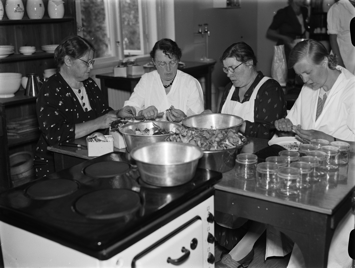 Husmödrar rensar svamp på "Elverkets" konserveringskurs i Fackskolan för huslig ekonomis "elektriska kök", Trädgårdsgatan 14