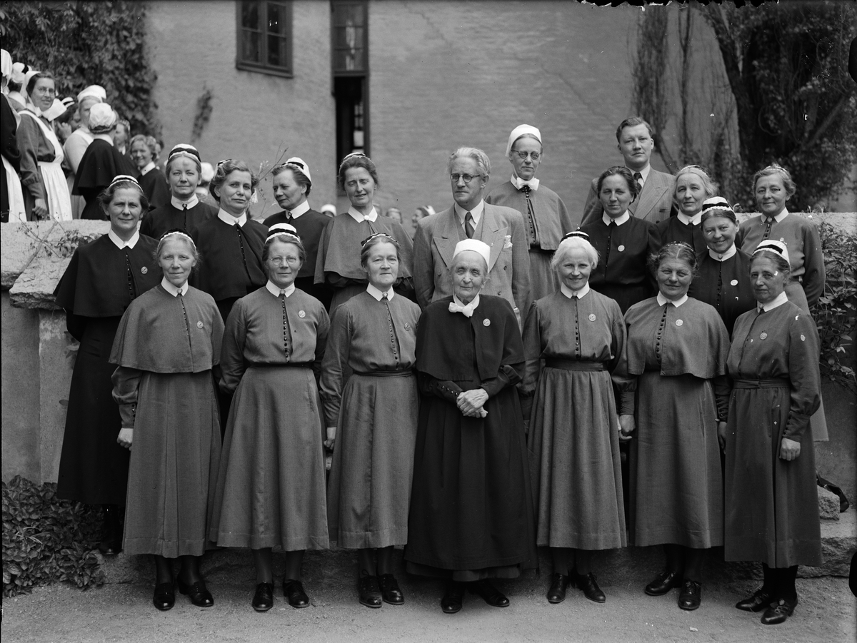 25-årsjubilerade diakonissor med Samariterhemmets föreståndare, pastor Samuel Palm, hemmets föreståndarinna syster Ebba Thollander och andre pastorn S Karlstrand