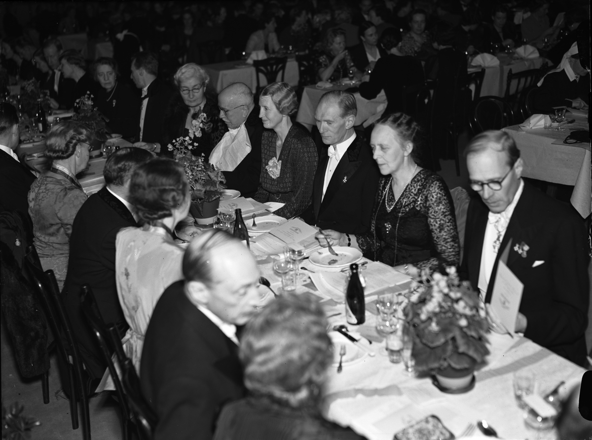 "Enskilda läroverket firade glansfull 50-årsfest" - honnörsbordet vid middagen i "studenternas gymnastiksal", Svettis, Uppsala november 1942